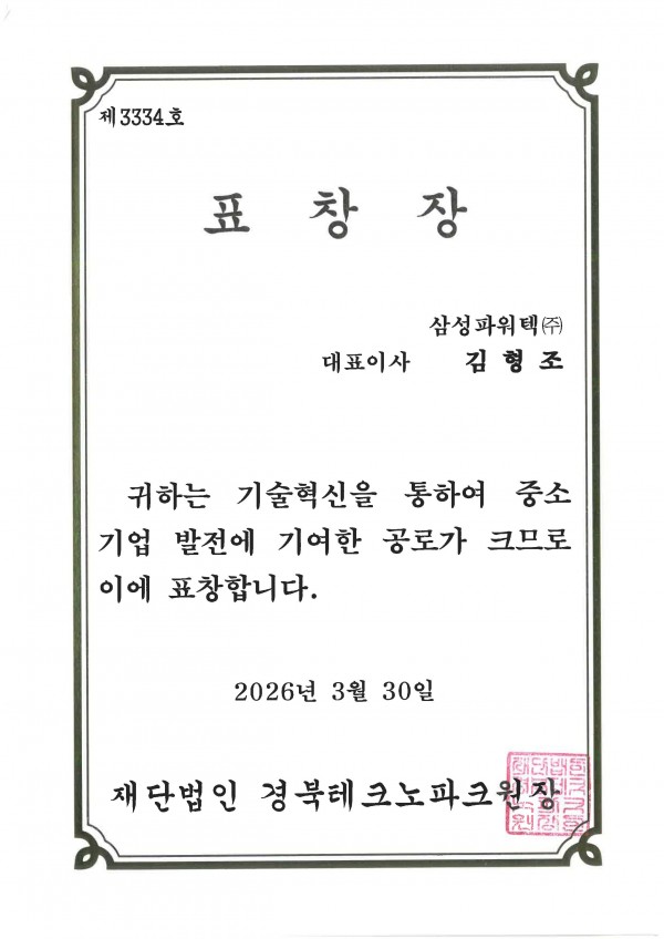 상장 2026 우수 이노비즈 기업 (재)경북테크노파크원장 표창장 페이지 정보 작성자 최고관리자 댓글 0건 조회 2회 작성일 26-04-03 14:15 목록 게시판 리스트 옵션 검색 본문 2026 우수 이노비즈기업 (재)경북테크노파크원장 표창장 [이 게시물은 최고관리자님에 의해 2026-04-03 14:17:44 게시판에서 이동 됨] 다음글2025중소기업인대회 과학기술정보통신부장관 표창 25.07.10